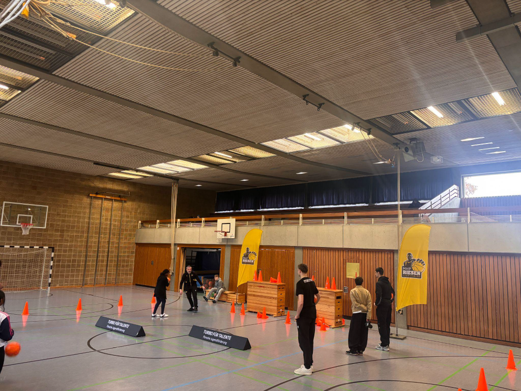 Den Auftakt bildete ein Kennenlerntraining an unserer Schule, das von Marc Salzer, dem verantwortlichen Trainer für die Schulkooperation der MHP RIESEN, geleitet wurde. Nach einem gemeinsamen Aufwärmen konnten die Schülerinnen und Schüler verschiedene Basketballübungen ausprobieren und ihre Technik beim Dribbeln, Passen und Werfen verbessern. In kleinen Spielformen stand vor allem der Spaß an Bewegung und Teamarbeit im Mittelpunkt.