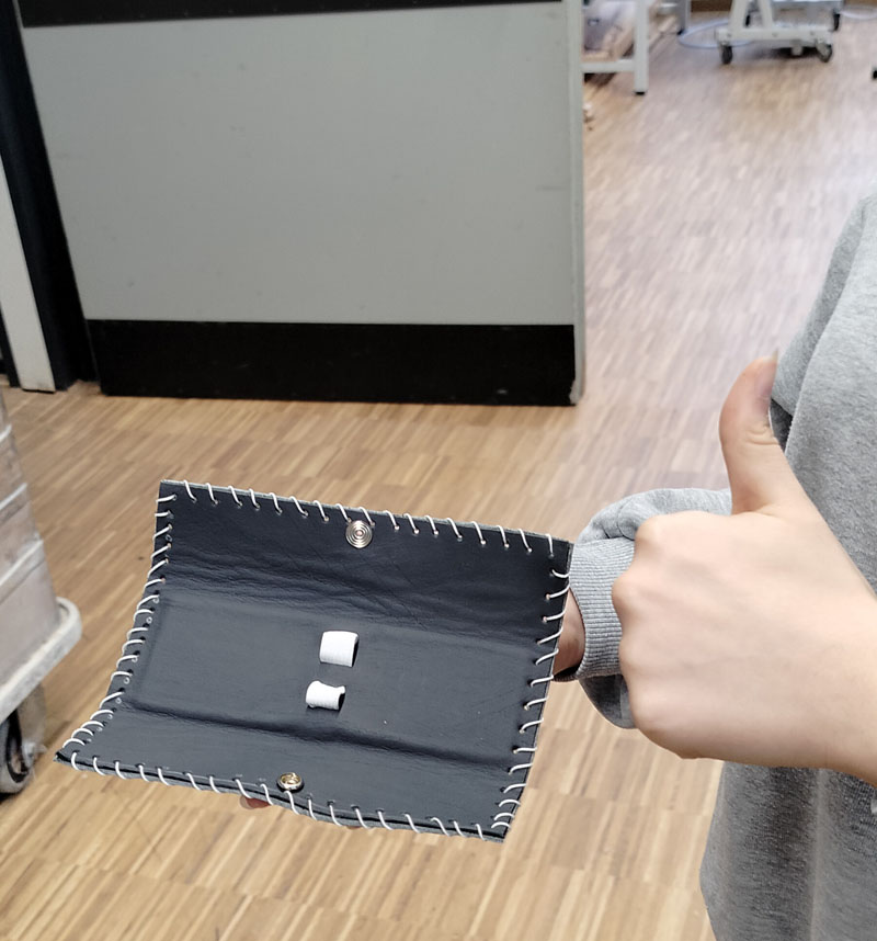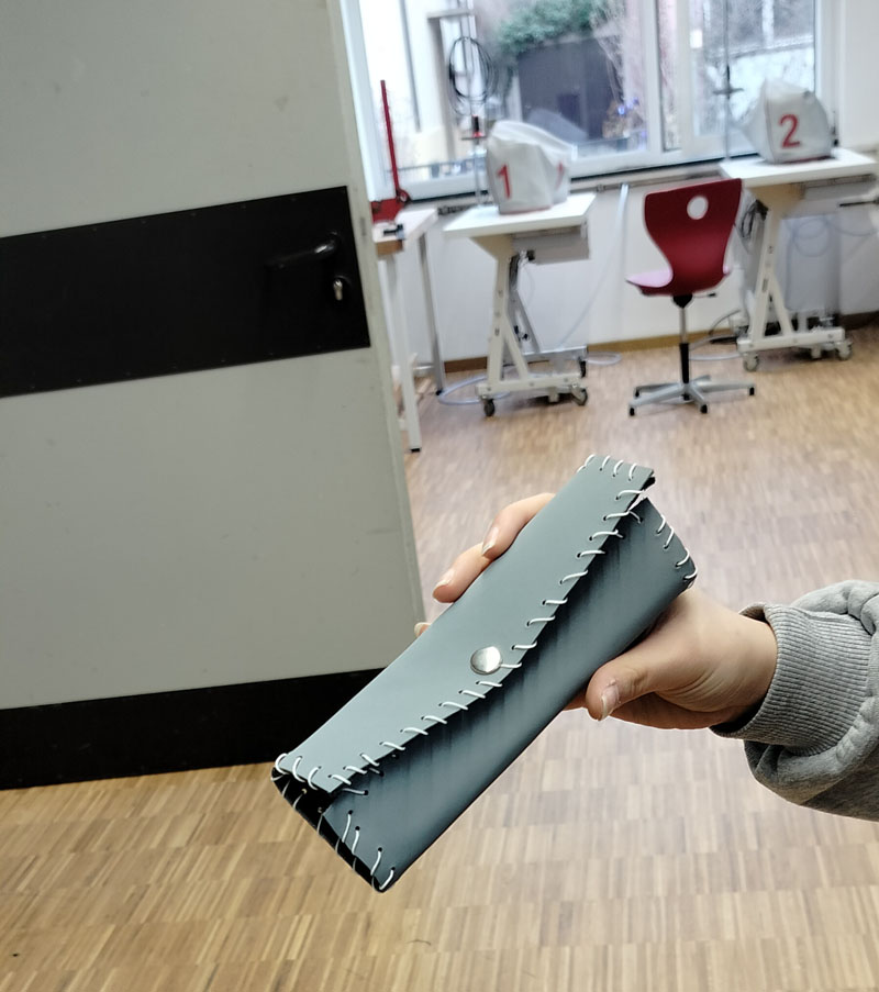 Die Aufgabe war es ein eigenes Federmäppchen aus Leder und Kunstleder zu fertigen. Dafür musste zunächst das jeweilige Leder passend zugeschnitten werden. | ![]() |